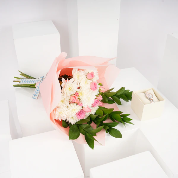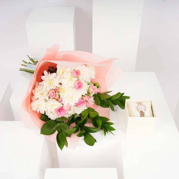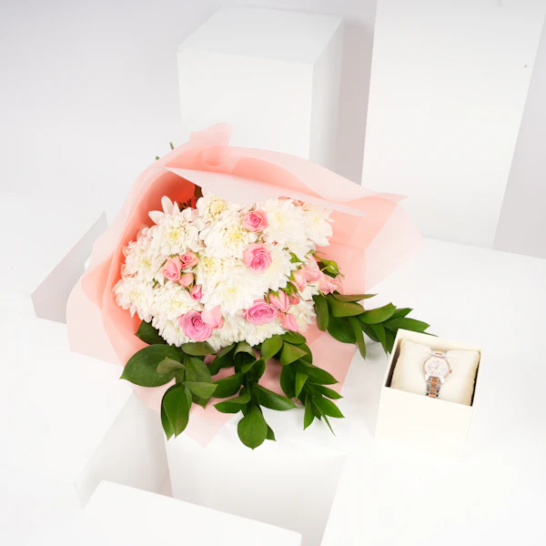 نُسقت هذه الباقة الناعمة مع ساعة نسائية فاخرة لتصنع هدية شاملة تجمع ما بين أناقة الوقت وجمال الطبيعة. هذه الهدية مثالية للمناسبات الخاصة مثل الأعياد أو الاحتفالات، معبرة عن مشاعر الحب والتقدير، وتعكس روحًا دائمة الجمال والأنوثة.
