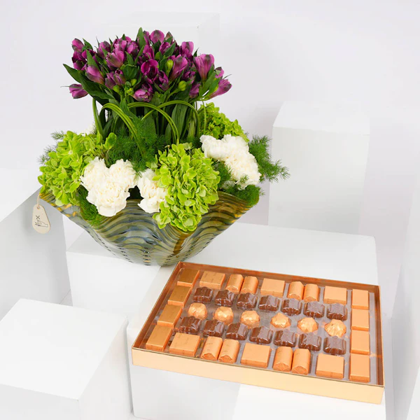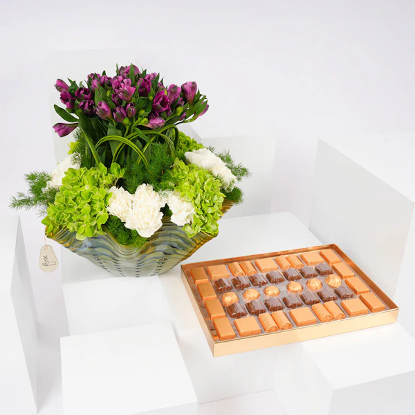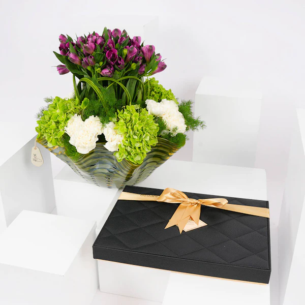 نُسقت هذه الهدية الأنيقة بالتعاون مع بستاني للشوكولاتة وفريقنا المبدع بتنسيق الأزهار لتكون الهدية المثالية لجميع مناسباتكم السعيدة.
