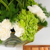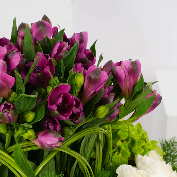- مزهرية زجاجية بتفاصيل ذهبية راقية مُنسقة بأزهار القرنفل البيضاء، أزهار الهيدرينجا الخضراء، أزهار الاستروماريا البنفسجية، نبات السرخس مع الستيل قراس.