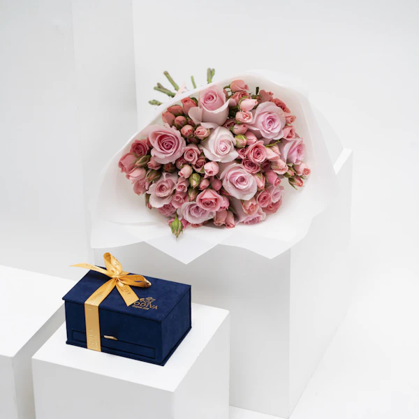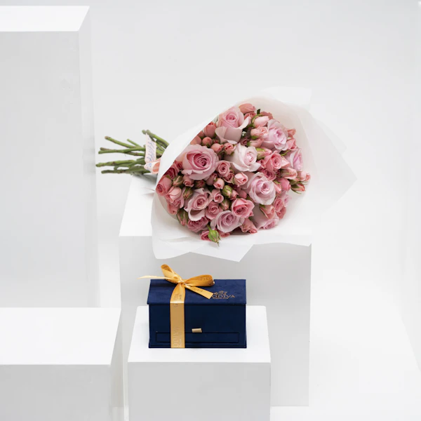 ر.س625تمتع بلحظات من الرفاهية واللذة مع هدية صندوق الشوكولاتة من جوديفا الذي يحتوي على مجموعة من النكهات الغنية تأتي في تقديم أنيق يجسد فخامة الشوكولاتة البلجيكية حيث يتلاقى الفن واللذة لخلق تجربة استثنائية. يحتوي صندوق رويال بوكس الميني باللون الأزرق الداكن على 6 قطع من البرالين والترافل و12 قطعة من جوديفا كاري. لإضفاء لمسة تميز على هذه الهدية، زُين هذا الصندوق مع باقة زهور منعشة مُنسقة بورد الجوري الوردي والبيبي جوري الوردي أيضاً.