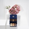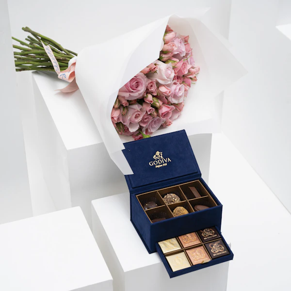 SKU FC99921تمتع بلحظات من الرفاهية واللذة مع هدية صندوق الشوكولاتة من جوديفا الذي يحتوي على مجموعة من النكهات الغنية تأتي في تقديم أنيق يجسد فخامة الشوكولاتة البلجيكية حيث يتلاقى الفن واللذة لخلق تجربة استثنائية. يحتوي صندوق رويال بوكس الميني باللون الأزرق الداكن على 6 قطع من البرالين والترافل و12 قطعة من جوديفا كاري. لإضفاء لمسة تميز على هذه الهدية، زُين هذا الصندوق مع باقة زهور منعشة مُنسقة بورد الجوري الوردي والبيبي جوري الوردي أيضاً.