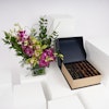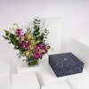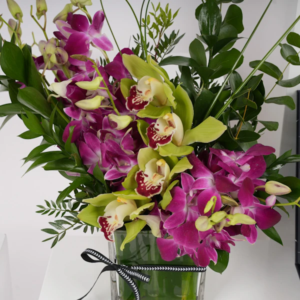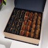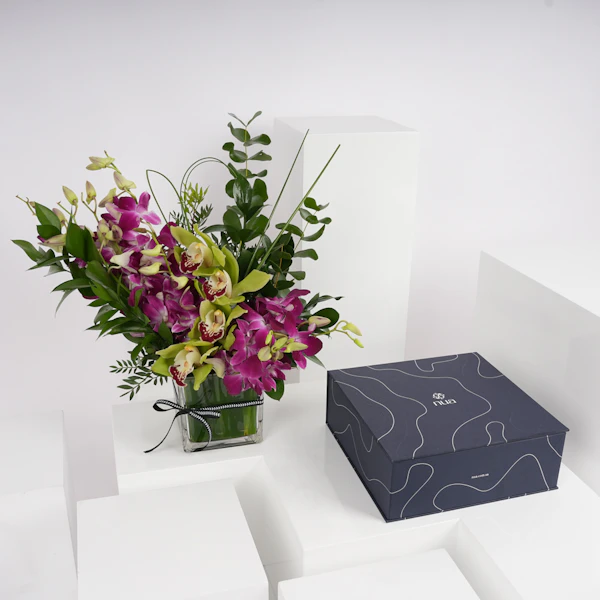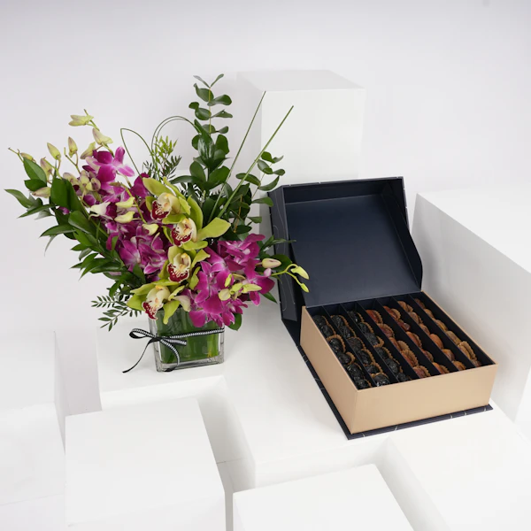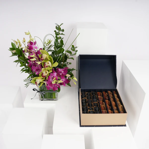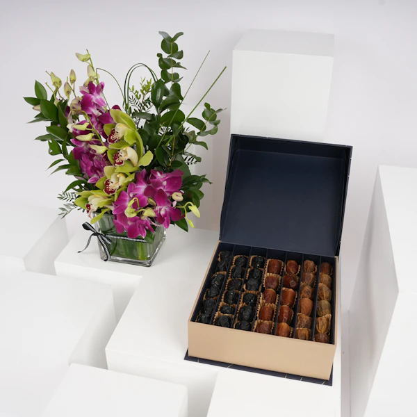 أضف مزيد من اللذة والسعادة إلى تجمعات عائلتك وأصدقائك بهذه الهدية الرائعة! صندوق تمور سيجنتشر بوكس كبير من نوا مع مزهرية زجاجية مربعة مزينة بزهور البيبي أوركيد البنفسجي وأزهار السمبيديوم الخضراء، معززة بأوراق الأوكالبتوس العطرية ومجموعة من الأوراق الخضراء المبهجة. هذه الهدية مصممة لتقدم تجربة لذيذة للجميع. تمتعوا بتشكيلة استثنائية من التمور الفاخرة، حيث تبرز كل نوعية بنكهتها الفريدة، وقوامها، ومظهرها، مما يعدكم بتجربة مذاق رائعة لا مثيل لها، ستجعل الجميع يبتسم ويتذكر اللحظات الرائعة التي قضوها معاً.
