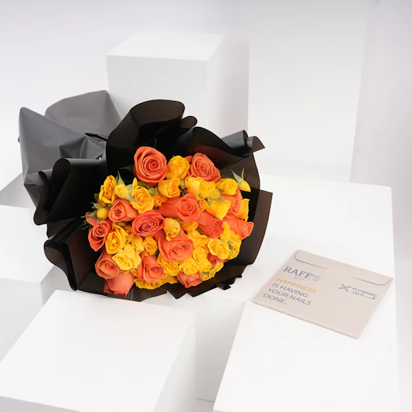 قم بإهداءها تجربة استرخاء فاخرة مع هذه الهدية المبتكرة! تتيح لها بطاقة الهدية خدمة جل اكستنشن في صالون تجميل راف من باريس للأظافر، حيث يمكنها الاستمتاع بأظافر رائعة الجمال. اسعدها بطريقة مبتكرة مع بطاقة هدية خدمة جل اكستنشن مع باقة الزهور المشرقة التي تتميز بورود البيبي جوري الصفراء الرقيقة وورود الجوري البرتقالية الحيوية، هذه الهدية ستجلب البسمة إلى وجهها والدفء إلى قلبها. فاجئها بمزيج مثالي من الجمال والأناقة مع فلاورد!