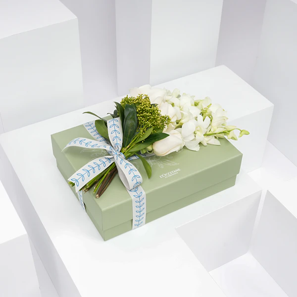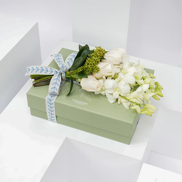 نُسقت هذه الهدية الأنيقة بالتعاون مع لوكستيان وفريقنا المختص بتنسيق الأزهار لتكون الهدية المثالية لمناسباتكم السعيدة.