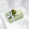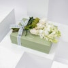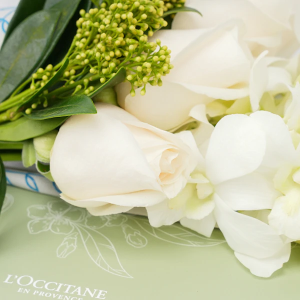 • تنسيق أزهار ناعم ولطيف يحتوي على الجوري الأبيض، أزهار بيبى الاوركيد البيضاء وأزهار السكيميا الخضراء.