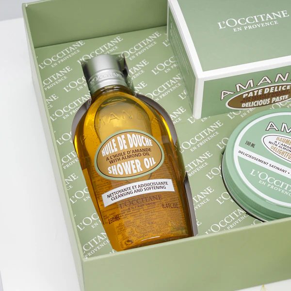 • مجموعة هدية اللوز المقشرة للجسم والتي تشمل: معجون اللوز المقشر للجسم 200مل، بلسم الروز المرطب 100مل، زيت اللوز للاستحمام 250مل وكريم اللوز للأظافر واليدين 75مل.