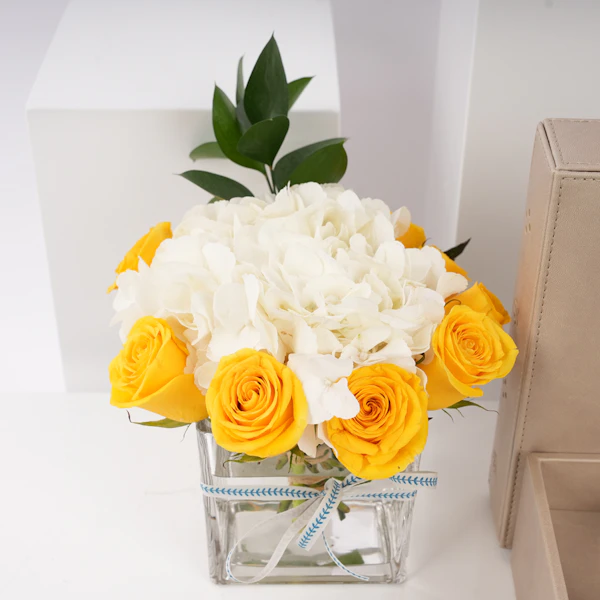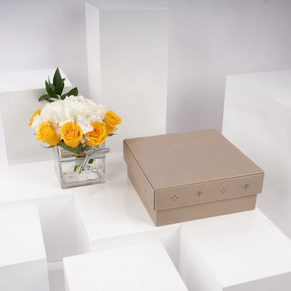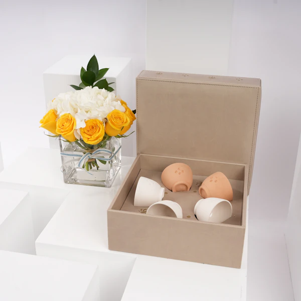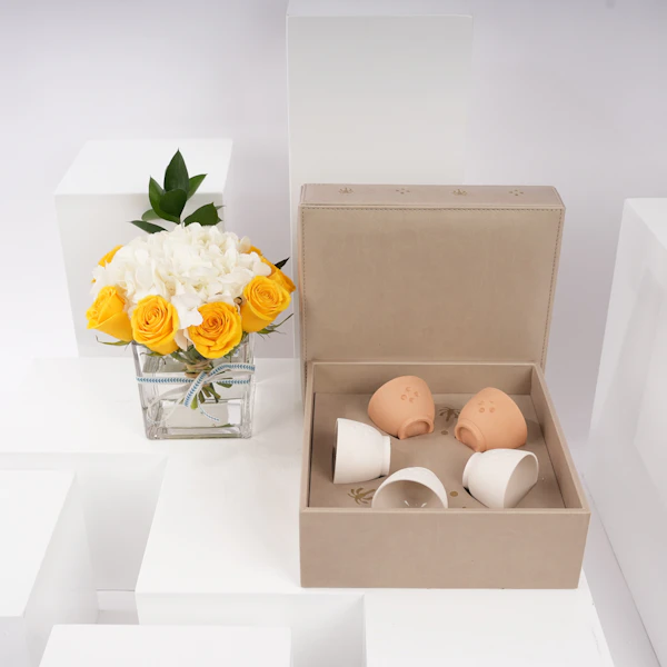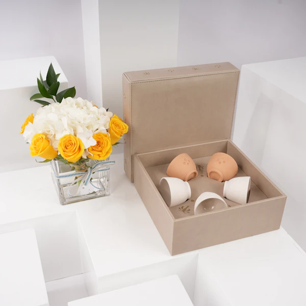 احتفل بيوم التأسيس السعودي بهدية تعبر عن  جوهر الوحدة والازدهار. مستوحاة من مجالس العلم والمعرفة تأتي مجموعة الفناجين الفريدة من التاريخ لتنقل لكم بأناقة وأصالة روح العلم والثقافة التي كانت تعم مجالس الدرعية في ذلك الوقت، بتصميم فني صنعها حرفيين سعوديين مبدعين، يعكس رونق التراث الغني والارتباط القائم بين الماضي والحاضر والفخر بالموروث الثقافي العريق والعلم المعرفي الوفير. مزين بالجوري الصفراء التي ترمز إلى الصداقة والهيدرانجيا البيضاء التي تمثل النقاء، كل كوب يحمل وعدًا باللحظات المشتركة والروابط الدائمة. يتم تقديم هذه المجموعة في مزهرية زجاجية مربعة الشكل، وهي بمثابة شهادة على القيم التي تربط شعب المملكة العربية السعودية معًا. وبينما يتجمع المتلقون حول هذه الكؤوس، نرجو أن يتم تذكيرهم بالروح الجماعية التي تحدد رحلة الأمة مع كل رشفة، أتمنى لهم نخب التقدم والازدهار والالتزام الثابت بمستقبل أكثر إشراقًا. تعتبر هذه الهدية بمثابة يوم التأسيس السعودي، وتكريم الماضي مع احتضان وعد الغد.