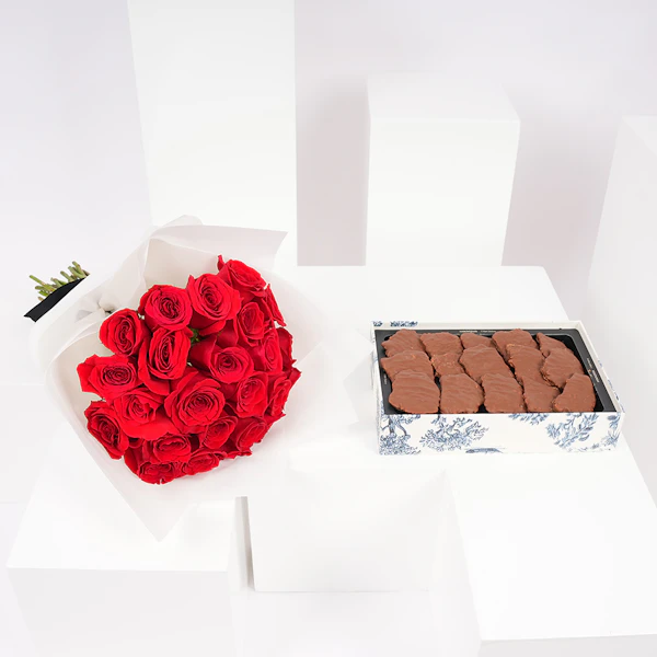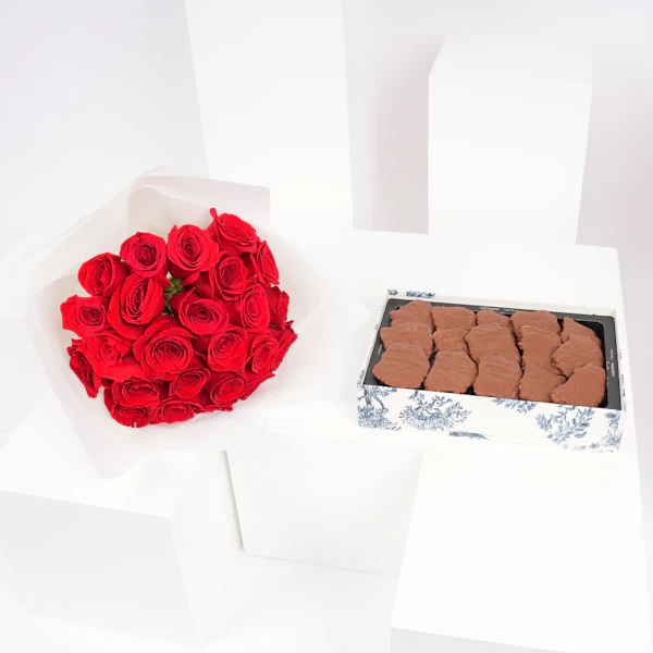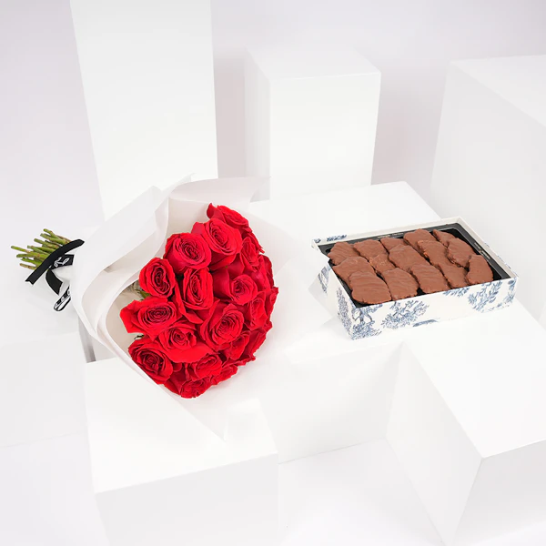احتفل بالحب مع هدية يوم الحب المميزة التي تتضمن كريب دولشي من هنوفيرين. استمتع بنكهة الشوكولاتة الطازجة بالحليب الممزوجة بحلاوة لا مقاومة من الكراميل المملح، مما يخلق متعة لا تُقاوم للحواس. مقترنة مع باقة من الجوري الحمراء الزاهية الملفوفة بغلاف باللون الأبيض النقي، تعتبر هذه الهدية تعبيرًا مثاليًا عن الحب والإعجاب. دع نكهة الشوكولاتة الكريب دولشي الفاخرة تذوب في فمك، بينما تأسر جمال الجوري قلبك. اجعل يوم الحب هذا لا يُنسى مع هذا التوليف الرائع من النكهات والزهور.