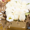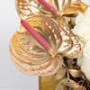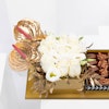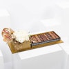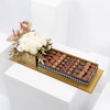 قاعدة ذهبية اللون ذات شكل طولي تحتوي في احد اطرافها على تنسيق من الجوري الابيض والانثوريوم الابيض ومرتبه توزيعات شوكلاته من ابوتشي على بقية القاعدة