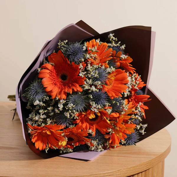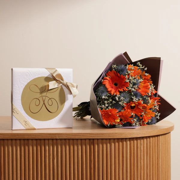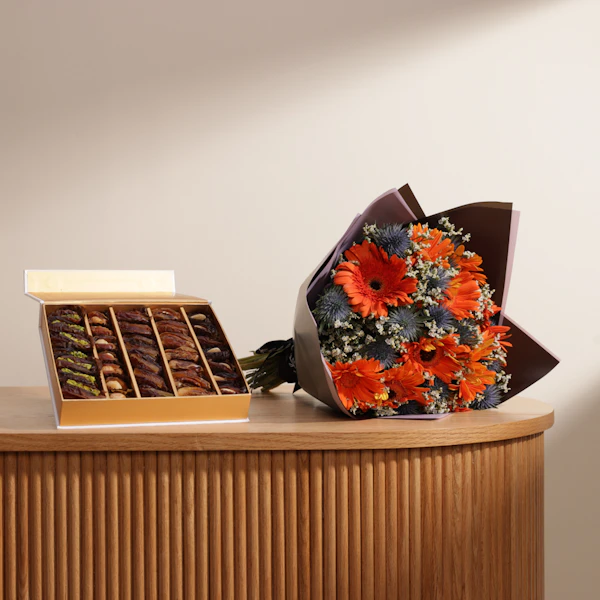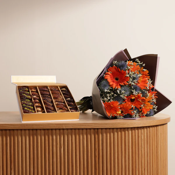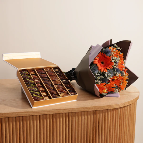 احتفل بمناسبتك بأناقة مع هدية مميزة صندوق تمر محشو من بتيل، حيث يمكنك الاستمتاع بمذاق الجودة والفخامة. تترافق الهدية مع باقة زهور تتألف من الجربارة البرتقالي والإرينجيوم الأزرق، مما يضفي لمسة من الجمال والأناقة الطبيعية على الهدية. هذا التناغم بين النكهات اللذيذة وجمال الزهور يجعل من الهدية خيارًا مثاليًا لإدخال السرور والفرح في الحدث الخاص بك.