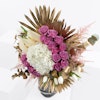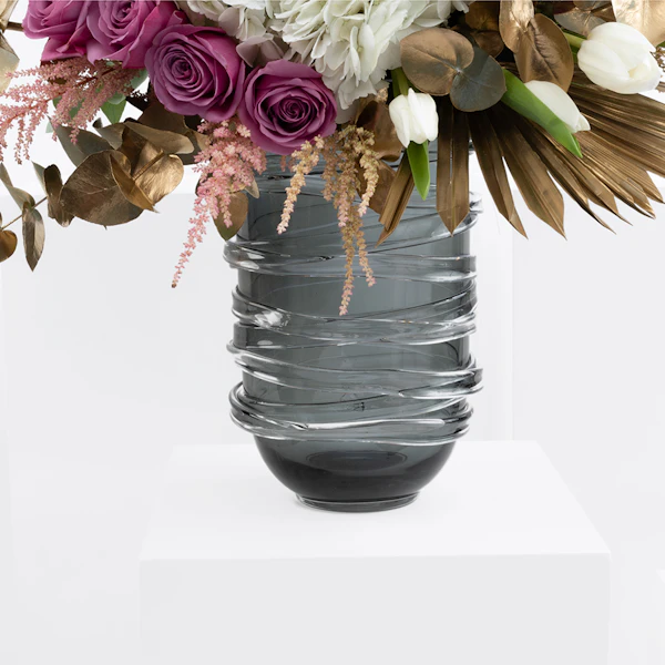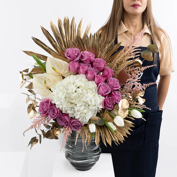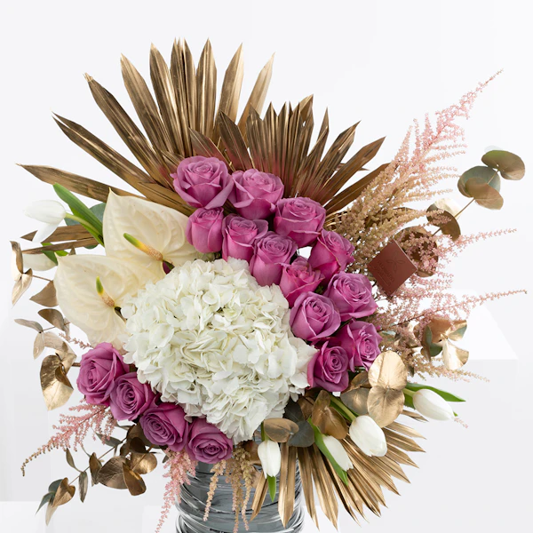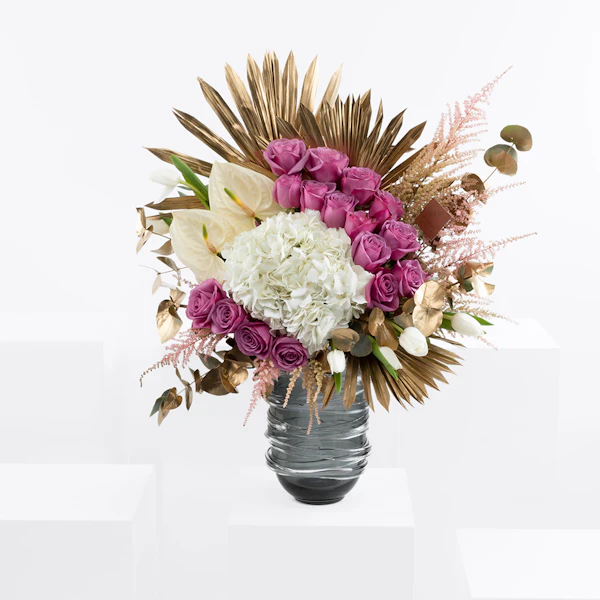 الجوري البنفسجي، الهيدرينجيا البيضاء ، الأنثوريوم ، توليب ، أستيلبي الوردي ، والأوكالبتوس مرتبة في مزهرية زجاجية رمادية تخلق ترتيبًا زهورًا مذهلاً. تضيف الورود البنفسجي لمسة من اللون والأناقة ، بينما تضيف زهور الكوبية البيضاء والأزهار الوردية النعومة والملمس. يضيف الأنثوريوم و التوليب لمسة من الغرابة والحيوية ، ويوفر الأوكالبتوس رائحة منعشة وعنصرًا طبيعيًا. تكمل المزهرية الزجاجية الرمادية ألوان الزهور وملمسها وتضيف لمسة من الرقي إلى المظهر العام.