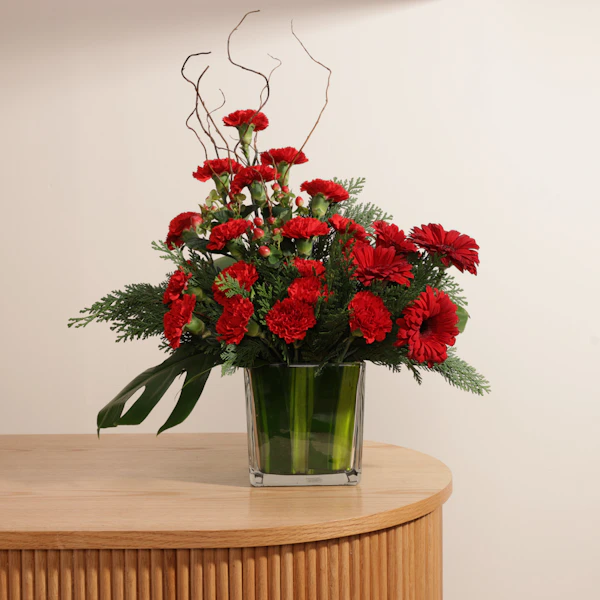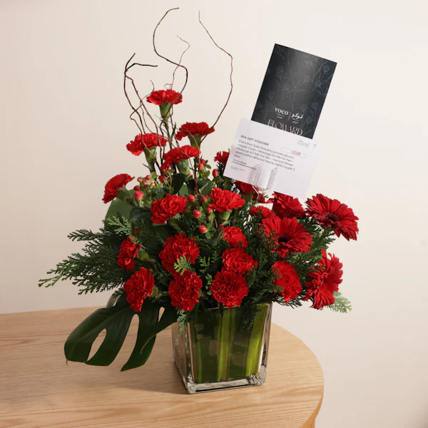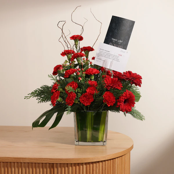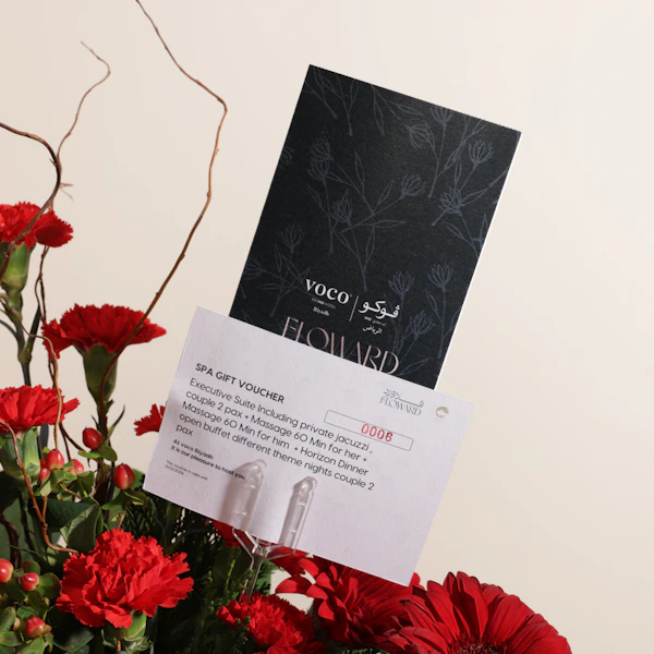 احتفل بالحب والرومانسية مع قسيمة الرومانسية من فوكو، حيث يمكنك اختيار المنطقة التي تفضلها، سواء الخبر أو الرياض، لتجربة لا تُنسى. تأتي القسيمة مع مزهرية تضم باقة فاخرة تشمل جوري أحمر يرمز للحب والعاطفة، وأنثوريوم أحمر للشغف والحماس، وتوليب أحمر للرومانسية والجمال، بالإضافة إلى بيبي أوركيد أحمر للأناقة والجمال. تقدم الزهور في فازة زجاجية أسطوانية أنيقة، تضفي لمسة من الفخامة والأناقة على أي مكان. اختر هذه القسيمة لتجربة لا تُنسى تملأ قلوبكم بالسعادة والرومانسية.