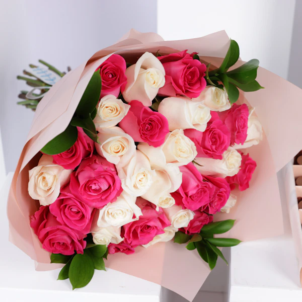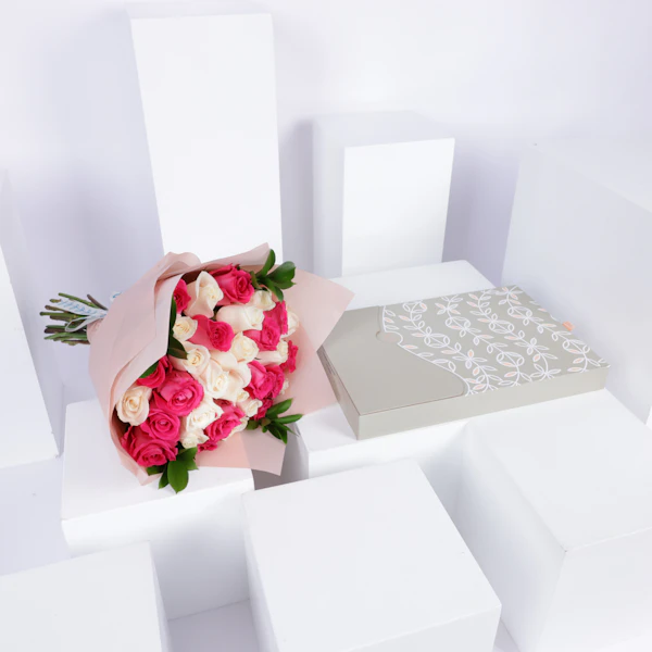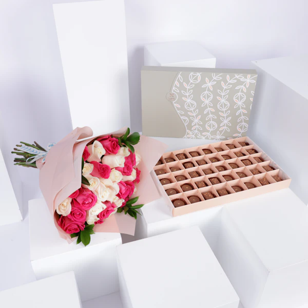 SKU FC98755استمتع بتجربة لا تُنسى مع علبة شوكولاتة منوعة من فلاورد. تتألف هذه العلبة الرائعة من 40 قطعة فاخرة من الشوكولاتة، حيث تمزج بين نكهتي الكراميل الغنية والشيكولاتة المقرمشة لتقديم مذاق لا مثيل له. ولكن الجمال لا يتوقف عند الشوكولاتة فحسب، بل يمتد إلى الزينة المثالية التي تزين العلبة، حيث تأتي مزينة بأجمل الزهور، جوري أبيض وجوري فوشيا، وتُلف بغلاف كريمي يضيف لمسة من الرقي والأناقة.تعتبر هذه العلبة هدية مثالية لكل المناسبات، سواء كانت لتقديمها لأحبائك في المناسبات الخاصة أو للاحتفال بلحظات الفرح والسعادة. فهي تعبر عن الذوق الرفيع والاهتمام بالتفاصيل، وستترك انطباعاً قوياً في قلوب مَن يتلقونها، مما يجعل الذكرى لا تُنسى والعلاقات تتعزز أكثر فأكثر.