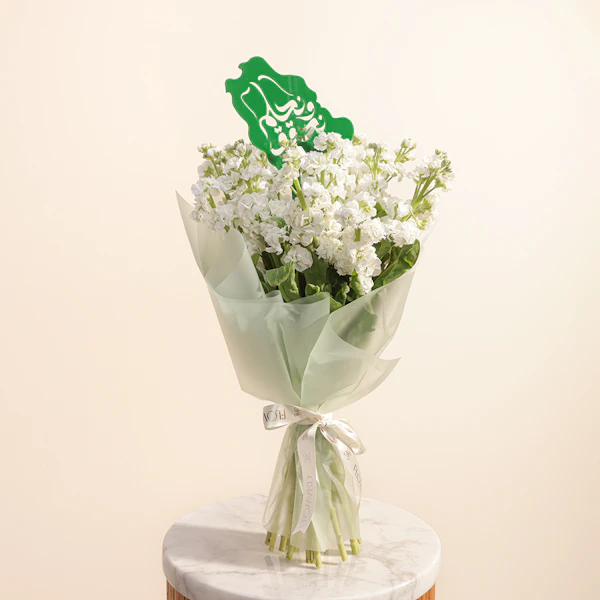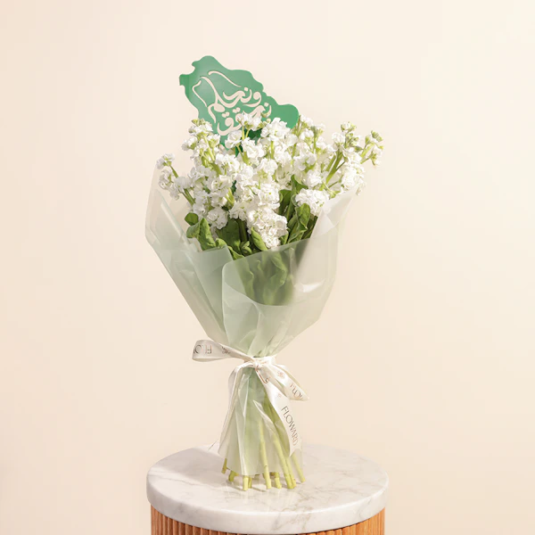 احتفل باليوم الوطني السعودي بلمسة من الأناقة والجمال مع باقة زهور بيضاء مخصصة لهذه المناسبة العزيزة. تتميز الباقة بنقاء وجمال ماتيولا بيضاء، التي تجسد الروح الوطنية برونقها الرقيق. كل زهرة مرتبة بعناية داخل غلاف أبيض فاخر يبرز جمال الزهور ويضفي لمسة من الفخامة. ولإكمال الباقة، أضفنا عود تزيين يحمل عبارة "نحلم نحقق" لتجعل هديتك تعبيرًا رائعًا عن حب الوطن. إنها الهدية المثالية لإحياء هذا اليوم المميز. اطلب الآن وشارك الفخر والاعتزاز مع من تحب!