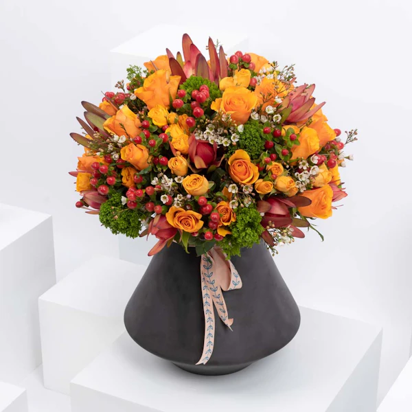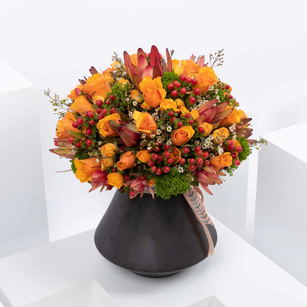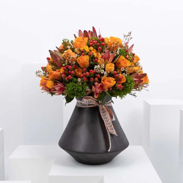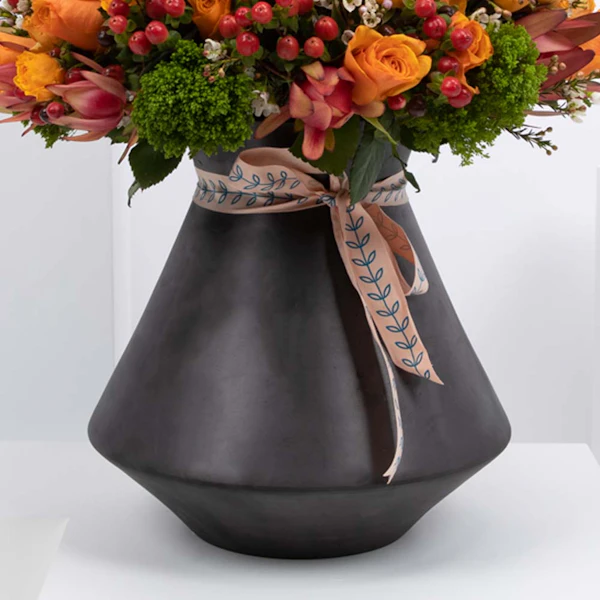 جاء الخريف مبكرًا مع هذه التركيبة اللونية المتطابقة مع المزهرية السوداء غير اللامعة.