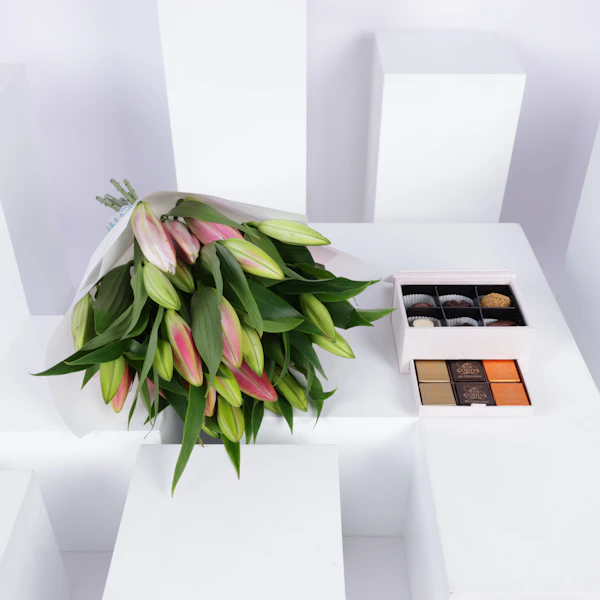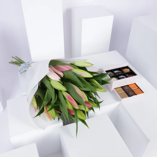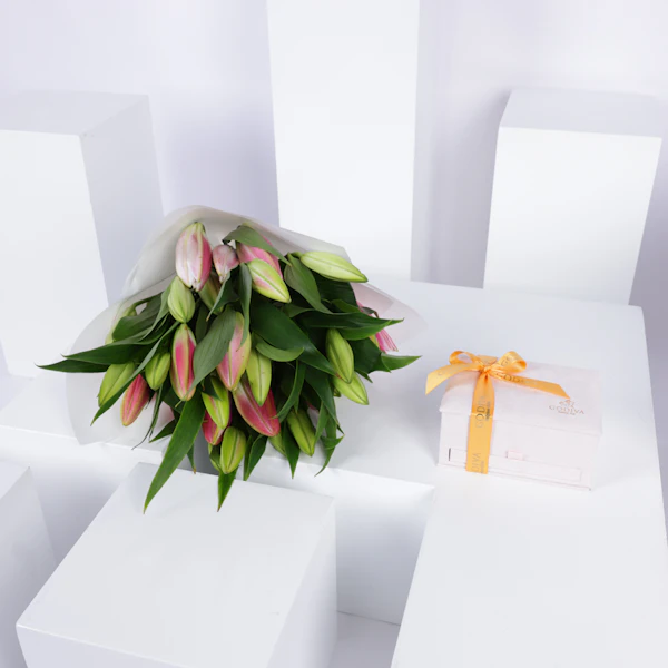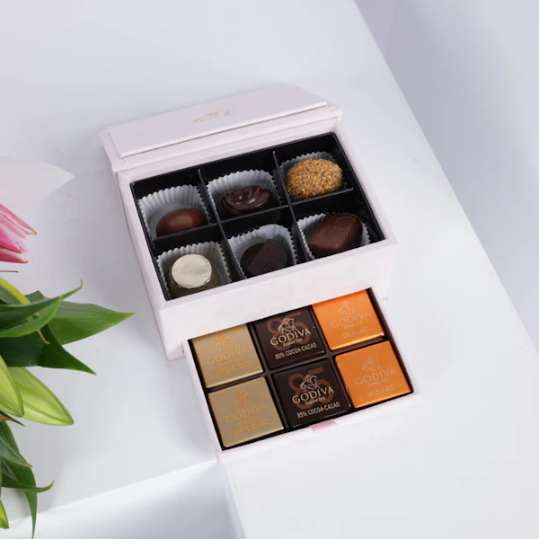 ارفعوا تجربة الهدايا إلى مستوى جديد مع صندوق شوكولاته رويال ميني من جوديفا، الذي يتضمن 18 قطعة فاخرة من الشوكولاتة. يأتي مع باقة فاخرة من ال الليليوم الوردى و الأبيض، ملفوفة بغلاف بشكل جميل باللون الأبيض. هذا التجمع هو تعبير مثالي عن الأناقة والذوق. تتناغم شوكولاتة جوديفا، المعروفة بجودتها الفائقة، مع أناقة ترتيب الزهور. تم تصميم هذه المجموعة لإسعاد الحواس وجعل أي مناسبة إضافية خاصة. افرحوا أحبائكم أو أنفسكم بهذا التوازن الرفيع بين الشوكولاتة اللذيذة والزهور الفاخرة، متاح الآن على موقعنا على الإنترنت.