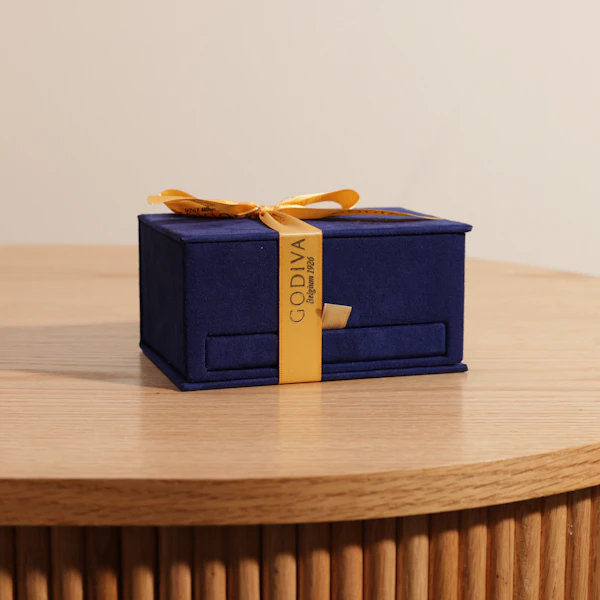 SKU FC58310قدّم لأحبائك علبة جوديفا رويال بوكس المميزة بلونها الأزرق الداكن، التي تعد خيارًا رائعًا لهدايا محبي الشوكولاتة. تحتوي هذه العلبة الفاخرة على مجموعة مختارة من قطع البرالين اللذيذة، الترافل الغنية، والكاريه الرائع، وجميعها مصنوعة بعناية في بلجيكا. استمتعوا بالقوام المخملي والنكهات الفاخرة التي تجعل من كل قطعة تجربة لا تُنسى. هذه الهدية ستضفي لمسة من الأناقة والفخامة على أي مناسبة.