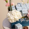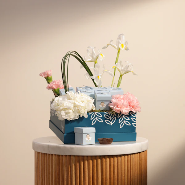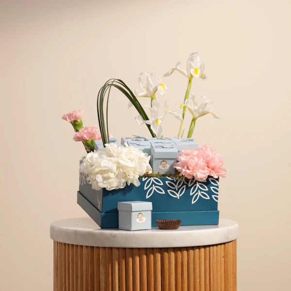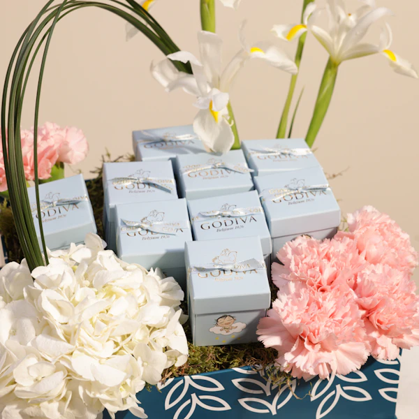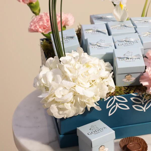 احتفلوا بوصول المولود الجديد بهدية رائعة حقاً صندوق شوكولاته باللون الأزرق من جوديڤا يتضمن 10 قطع من أرقى أنواع الشوكولاته. إلى جانب هذه اللذيذة، باقة أنيقة تتألف من هيدرانجيا بيضاء ناصعة، ترمز إلى النقاء، وإيريس بيضاء تعبيراً عن الحب والعطف، وكارنيشن وردي يرمز إلى الفرح واحتفالية الحياة الجديدة. هذا الجمع المدروس يجسد طيف الفرح والأمل الذي يأتي مع ولادة الطفل، متمنين السعادة والسرور للآباء الفخورين ولإضافة الجديدة الثمينة لهم.