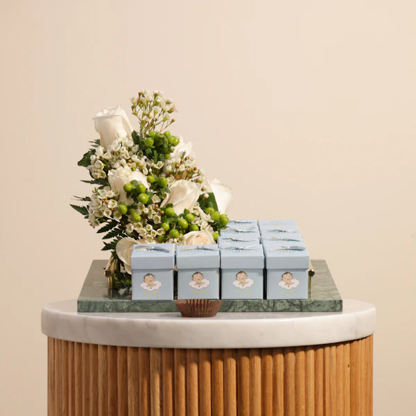 توزيعات شوكولاتة المولود الجديد صبي من جوديفا | صينية زهور