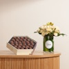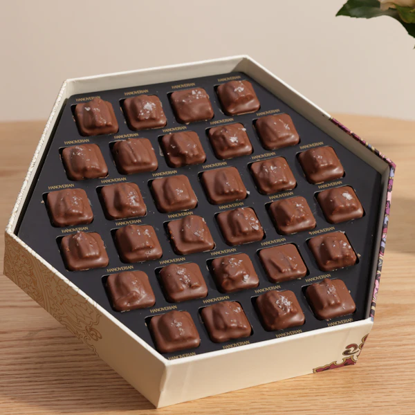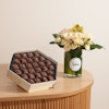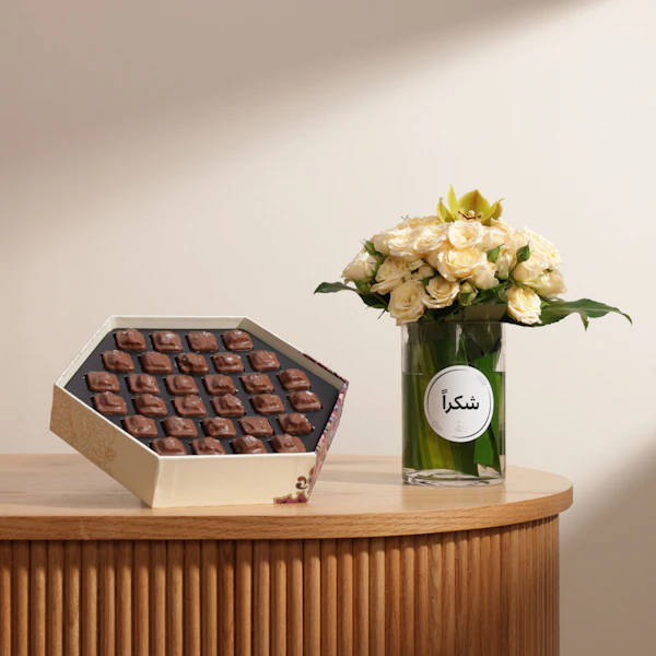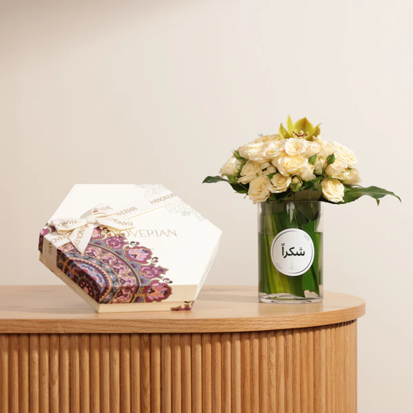 اجعل لحظات من تحب مميزة أكثر مع شوكولاتة هنوڤيرين الفاخرة. اختر من بين تشكيلة متنوعة من الشوكولاتة المصنوعة بحب وإتقان، وقدمها مع باقة من الزهور التي تحبونها في فازة زجاجية أنيقة. هذه التوليفة تجمع بين الذوق الرفيع والجمال الطبيعي، لتعبر عن امتنانك بأجمل طريقة. أضف لمسة من الأناقة والرقي لكل مناسبة واجعلها لحظات لا تُنسى.