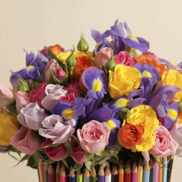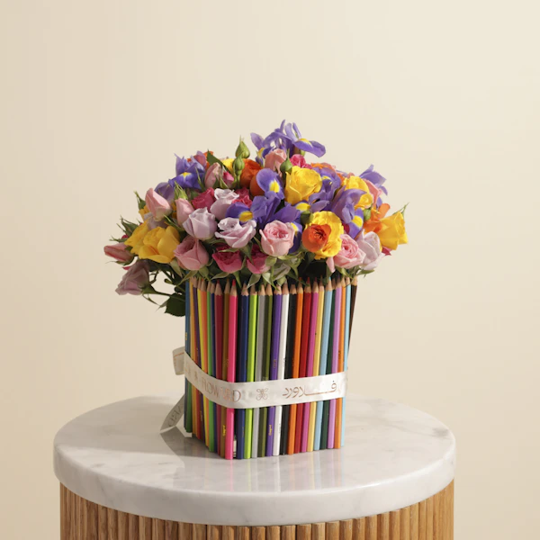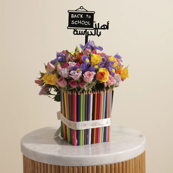 استعد للعودة إلى الدراسة بلمسة من الفن والجمال مع هدية تجمع بين الألوان الطبيعية والتصميم الرائع! احصل على ألوان خشبية من مكتبة جرير، 48 قلمًا تضفي إبداعًا وتميزًا على كل رسمة. لتكتمل هذه الهدية المبهجة، تأتي مزهرية زجاجية أنيقة مملوءة بزهور بيبي جوري وردية، بنفسجية، برتقالية، فوشيا، وصفراء، إضافة إلى زهرة سيمبيديوم الخضراء وزهرة السوسن الزرقاء. عود تزيين خاص بالعودة إلى الدراسة يضفي لمسة مميزة تجعل هذه الهدية مثالية لبدء العام الدراسي بروح من التفاؤل والإبداع. أضف لمسة من الألوان والجمال إلى حياتك الدراسية، واطلب أحلى هدية الآن لتبدأ مغامرتك الدراسية بأناقة لا تُضاهى!