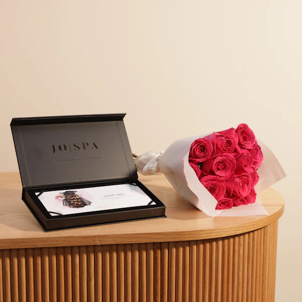 دلّل نفسك أو أحبائك بتجربة فاخرة مع قسيمة إهداء من جو سبا، المصحوبة بباقة ساحرة من الزهور. تجمع هذه الهدية بين الاسترخاء والجمال، مما يجعلها الاختيار المثالي للمناسبات الخاصة أو لتقديم لمسة من العناية والاهتمام. اطلب الآن لتقديم هدية فريدة تمزج بين التدليل والهدوء في لحظات لا تُنسى!