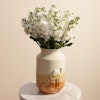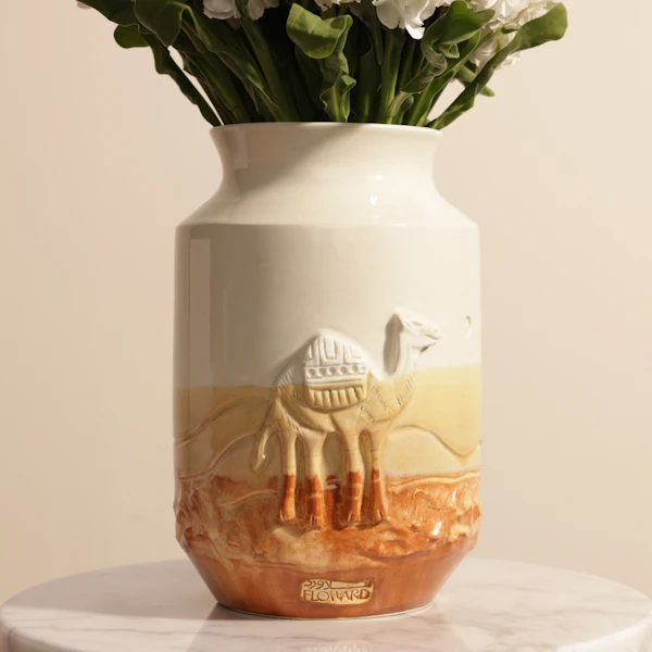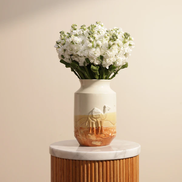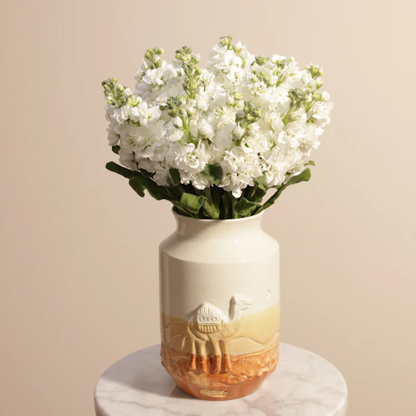 Elevate your space with a luxurious blend of tradition and elegance through this exquisite arrangement of white Matthiola flowers, nestled in a handcrafted ceramic vase by Keramos Studio. Made from pristine white clay, the vase features an intricate camel design, a nod to the rich Saudi heritage. This piece transcends ordinary decor, merging the timeless beauty of white Matthiola with the artistic sophistication of Saudi craftsmanship. Perfect for those with a discerning taste, this arrangement not only celebrates the natural grace of the flowers but also honors the cultural legacy of Saudi Arabia. Whether as a premium gift or a statement piece, it exudes an air of refinement and cultural pride, making it a captivating addition to any setting.