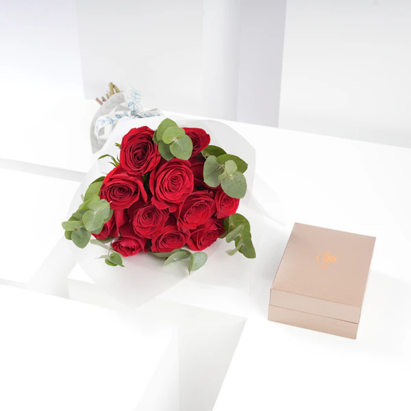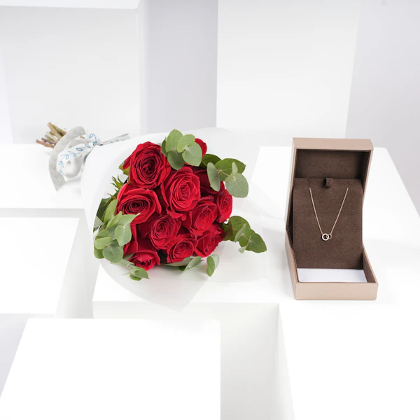 SKU FC75748اختر هذه الهدية المثالية لتعبر عن مشاعرك واحاسيسك العميقة في يوم الحب، حيث صُممت هذه القلادة بكل دقة وحرفية من مجوهرات الكوهجي بتصميم يتكون من دوائر متداخلة احداهما مزينة بالألماس المتألق والأخرى بذهب الروز جولد عيار 18 قيراط. يرمز تصميم الدوائر في هذه القلادة الى الروابط المشتركة والارتباط الدائم بين القلوب مما يجعلها اختياراً متميزاً لهذا اليوم الفريد. تأتي هذه الهدية الفاخرة مع باقة مُنسقة بكل عناية بـ12 وردة من ورود الجوري الحمراء التي تدل على معاني الشغف ومشاعر الحب الخالدة.