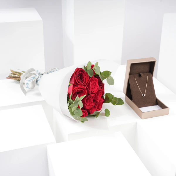 ر.س2345اختر هذه الهدية المثالية لتعبر عن مشاعرك واحاسيسك العميقة في يوم الحب، حيث صُممت هذه القلادة بكل دقة وحرفية من مجوهرات الكوهجي بتصميم يتكون من دوائر متداخلة احداهما مزينة بالألماس المتألق والأخرى بذهب الروز جولد عيار 18 قيراط. يرمز تصميم الدوائر في هذه القلادة الى الروابط المشتركة والارتباط الدائم بين القلوب مما يجعلها اختياراً متميزاً لهذا اليوم الفريد. تأتي هذه الهدية الفاخرة مع باقة مُنسقة بكل عناية بـ12 وردة من ورود الجوري الحمراء التي تدل على معاني الشغف ومشاعر الحب الخالدة.