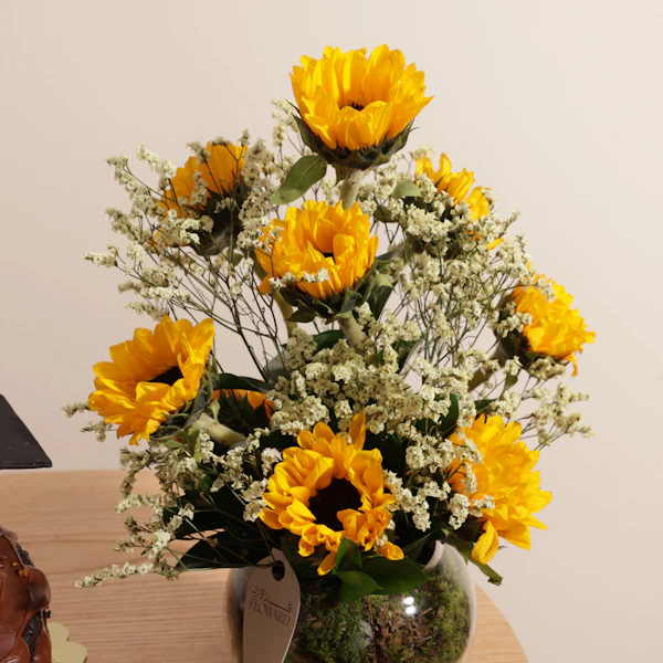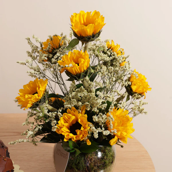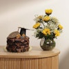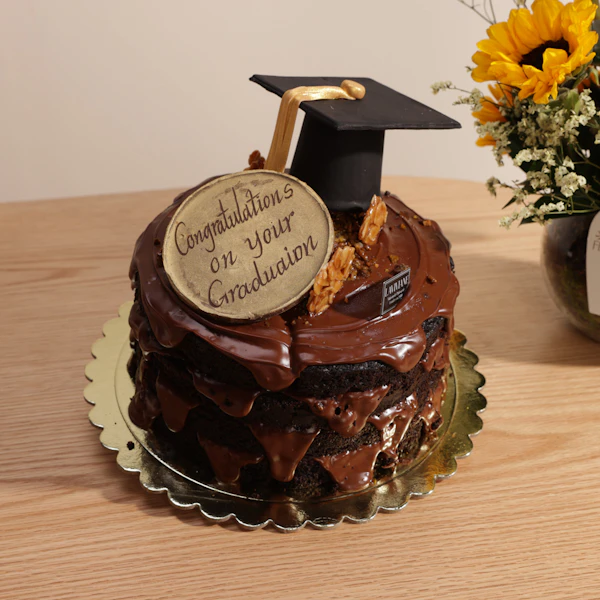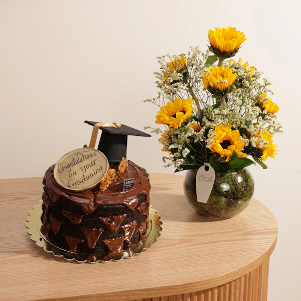 احتفل بسعادة وفرحة لحظة تخرج من تحب مع كيكة النوتيلا الفاخرة من لاڤيڤيان، مزينة بقبعة تخرج ولوحة تحمل عبارة "مبروك التخرج". يتم تقديم الكيك بأناقة مع باقة مبهجة من زهور دوار الشمس في فازة زجاجية دائرية، مما يجعلها هدية مثالية تضفي لمسة من الفرح والفخر على هذه المناسبة الخاصة. شارك من تحب سعادة هذا الإنجاز المميز بأكثر الطرق حلاوة وجمالًا.