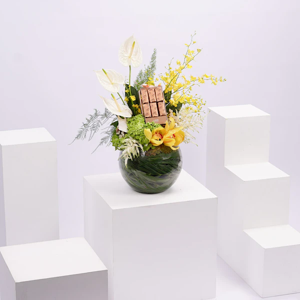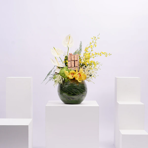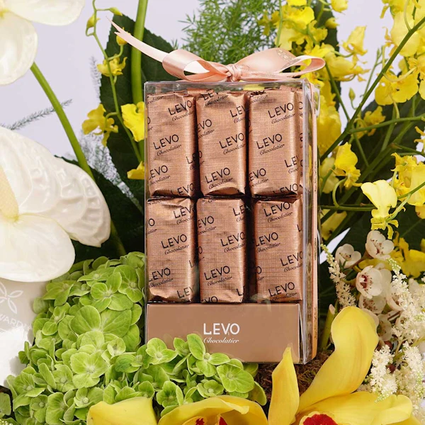 بالتعاون مع ليفو للشكولاتة الفاخرة وفريقنا المختص بتنسيق الأزهار، تم تنسيق صندوق الشكولاتة هذا ليكون إضافة راقية لجميع مناسباتكم السعيدة مع أحبائكم.