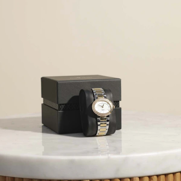 أضف لمسة من الأناقة والفخامة ليوم من تحب مع ساعة برستيج النسائية من أفاليري. تتميز الساعة بتصميم أنيق ومميز يجمع بين الفضي والذهبي، مع مينا بيضاء تضفي لمسة من الأناقة الراقية. مصنوعة من الستانلس ستيل عالي الجودة، ومرصعة بالماس لإضافة لمسة من البريق والجمال. تعمل بتقنية الكوارتز لدقة وموثوقية في الوقت. هدية رائعة تعبر عن اهتمامك وتقديرك لأحبائك، مثالية لتبرز أناقتهم وسحرهم الخاص.