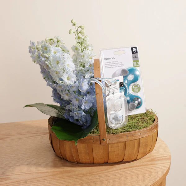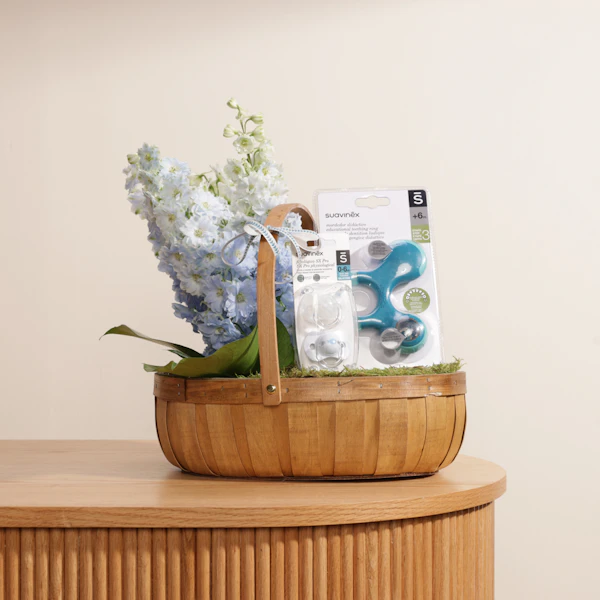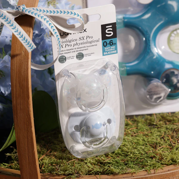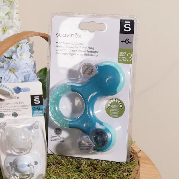 تقديم مجموعة الهدايا المثالية للرضع والأطفال الصغارلهاية من سوافينيكس للرضع، للأعمار من 0 إلى 6 أشهر، مع عضاضة زرقاء مصممة للأطفال من عمر 3 إلى 6 أشهر، والتي تتميز بتصميم جميل باللون الأزرق. صُنعت اللهاية بعناية وأمان لتوفير الراحة والتخفيف للرضع خلال شهورهم الأولى، بينما توفر العضاضة الزرقاء الإغاثة خلال مرحلة الأسنان، مساعدة في تطوير لثتهم وعضلات فكهم.مع الترتيب الرائع للدلفينيوم الازرق يعطى تميزا لهذة الهدية هذا التوافق الذكي يضمن توفير الأدوات الضرورية لراحة الطفل ورفاهيته، سواء للطفل أو للوالدين.