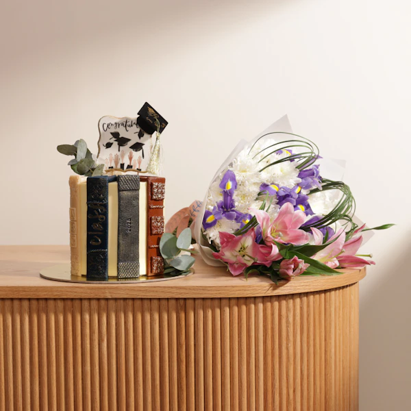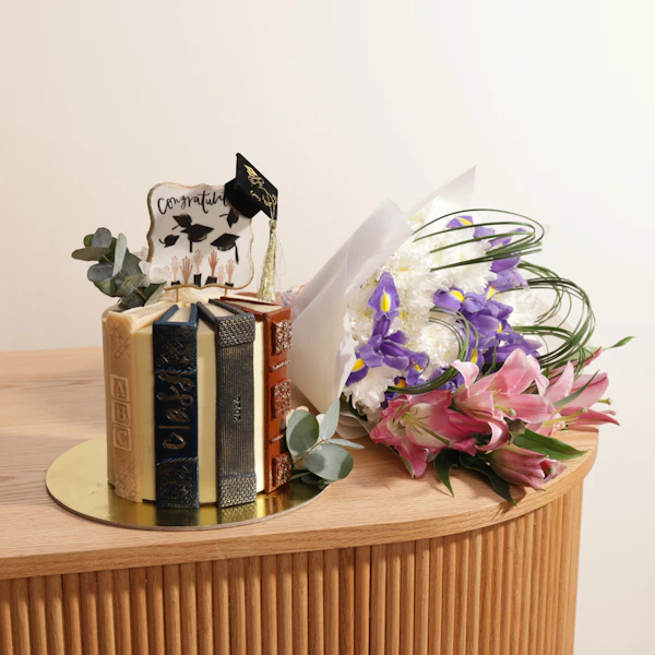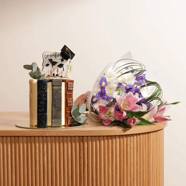 SKU FC09564هذه الهدية المختارة بعناية من سويت اتيليه هى الطريقة المثالية لإحياء ذكرى إنجاز عظيم. نقدم لكم الكيك ذات الحجم الكبير، والمناسبة لـ ١٢ إلى ١٦ شخصاً، تشكيلة رائعة من النكهات. استمتع بلذة الفانيليا، ومتعة الكراميل المالح، والملمس المقرمش الذي لا يُقاوم للكيك، وكلها مجتمعة لتخلق تجربة لا تُنسى. ولإكمال الكيك اللذيذة، تأتي هذه الهدية برفقة باقة زهور مذهلة. تضم الباقة زهور السوسن الزرقاء الزاهية التي ترمز إلى الأمل والحكمة، والأقحوان الأبيض النقي الذي يدوم سعادته، والليليوم الوردية الرقيقة التي تمثل بدايات جديدة، لتضيف هذه الباقة لمسة من الأناقة وتعبر عن تهانيك بهذه المناسبة المثالية.