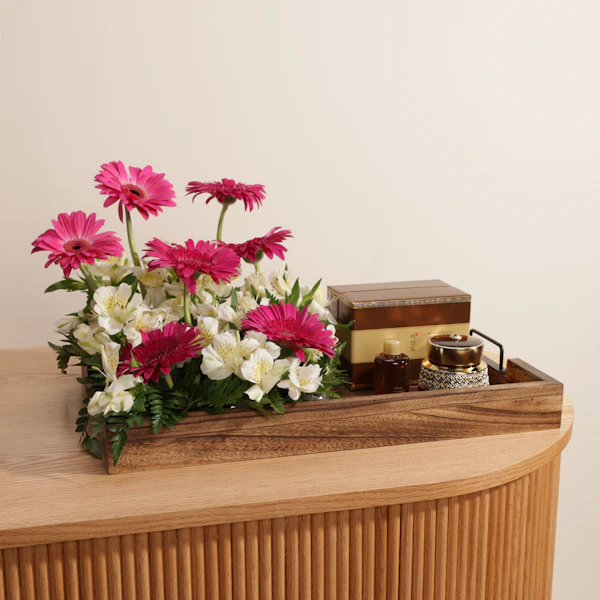 استمتع بتجربة فريدة مع مجموعة يهودام ميونغهان ميندو سبشيال من ذا فيس شوب. تتألف هذه المجموعة من كريم يهودام ألتيميت ميونغهان ميندو وزيت يهودام ألتيميت ميونغهان ميندو، تجمع بين حكمة الطبيعة ومعرفة الجمال الكورية التقليدية. توفر هذه المنتجات العناية الكاملة لمكافحة الشيخوخة، مما يمنح بشرتك إشراقة وأناقة. كريم مغذي ومرطب يمنح بشرتك التغذية الغنية والمرونة، بينما يعمل زيت الكاميليا على ترطيب البشرة بعمق وتغذيتها لتحقيق مظهر مشرق. ولإضفاء لمسة جمالية إضافية، تأتي المجموعة مع زهور الجرباره الفوشيا وألستروميريا البيضاء في صينية خشبية.