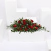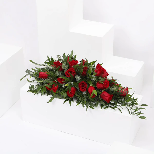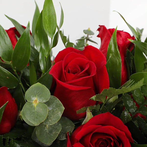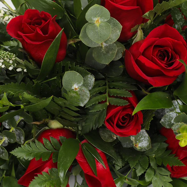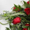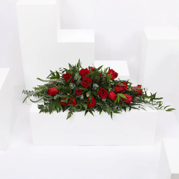 تنسيق زهور لتزيين طاولة الطعام تحتوي على روسكوس إيطالي أخضر ، أوكالبتوس سينيريا ، أوراق خضراء ، ورود الجوري الحمراء ، فيرونيكا بيضاء