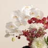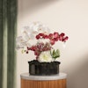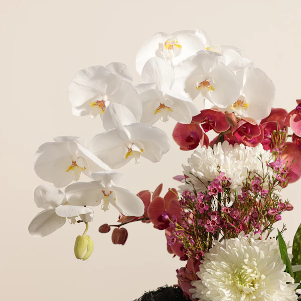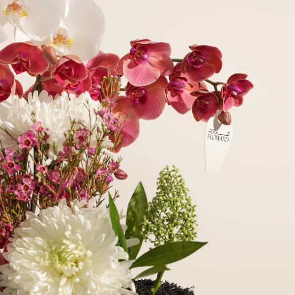 استمتع بأناقة وجمال فازة الزهور الفخمة التي نقدمها لك. صممت هذه الفازة الزجاجية المستديرة لتكون تحفة فنية في ديكور منزلك، حيث تضم تفاصيل مذهلة من أقحوان أبيض ناصع، أوركيد وردي أنيق، وأوركيد أبيض رائع. كل زهرة تضيف لمسة من الرقي والفخامة، مما يجعل هذه الفازة خياراً مثالياً للتزيين أو كهدية مميزة. لا تتردد في تجديد منزلك بأناقة؛ اطلب الآن وتمتع بجمال التفاصيل وروعة التصميم التي تضيف لمسة من الفخامة لأي مساحة.
