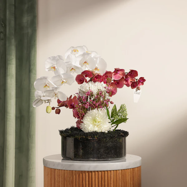 ر.س639استمتع بأناقة وجمال فازة الزهور الفخمة التي نقدمها لك. صممت هذه الفازة الزجاجية المستديرة لتكون تحفة فنية في ديكور منزلك، حيث تضم تفاصيل مذهلة من أقحوان أبيض ناصع، أوركيد وردي أنيق، وأوركيد أبيض رائع. كل زهرة تضيف لمسة من الرقي والفخامة، مما يجعل هذه الفازة خياراً مثالياً للتزيين أو كهدية مميزة. لا تتردد في تجديد منزلك بأناقة؛ اطلب الآن وتمتع بجمال التفاصيل وروعة التصميم التي تضيف لمسة من الفخامة لأي مساحة.
