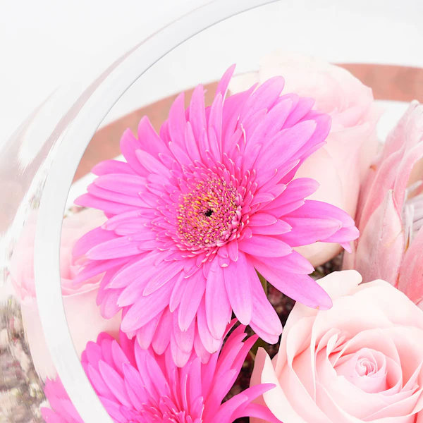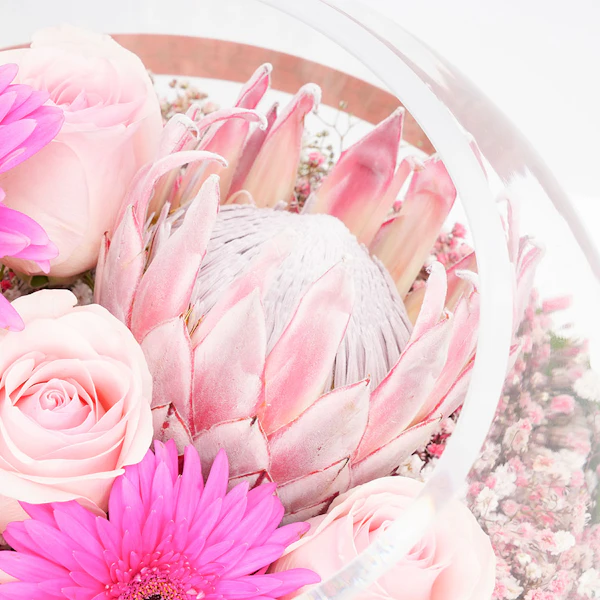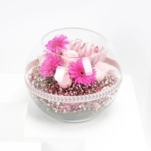 ابتكرها بائعو الأزهار الفنيون لدينا لإضفاء البهجة على أي مساحة بحضورها الجميل، أو لمجرد تقديمها كهدية لأحبائك. يحتوي هذا الترتيب الحلو على مجموعة من فوشيا جيربيرا، وجبسوفيلا وردي، وورود إسبيرانس، وأسبيدسترا خضراء، وبروتيا وردية. كلها ملفوفة في مزهرية زجاجية كلاسيكية جاهزة لإرسالها إلى أحبائك. اجعل لحظاتك الثمينة أكثر بهجة.