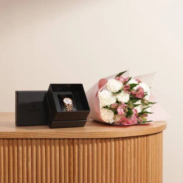 SKU FC94828تألقي مع هدية ساعة برستيج النسائية من أفاليري من الشايع، المصنوعة من الستانلس ستيل بلون روز جولد الأنيق. هذه الساعة الفاخرة ليست مجرد أداة لقياس الوقت، بل هي قطعة أنيقة تزين معصمك وتضفي لمسة من الفخامة على إطلالتك. تأتي هذه الهدية المميزة مع باقة زهور رائعة من الألستروميريا الوردية والكارنيشن الأبيض، مما يضفي لمسة من الجمال الطبيعي والانتعاش. اهدي من تحب هذه الساعة الرائعة مع باقة الزهور لتعبري عن مشاعرك وتضيفي لمسة من الأناقة والرقي إلى يومها.