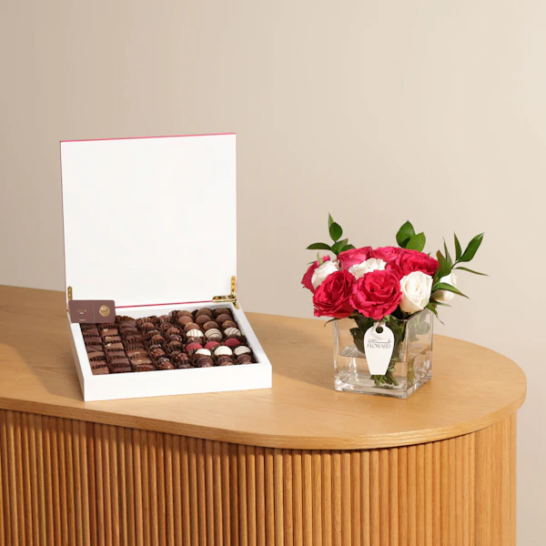 ر.س1230استمتع بالترف التام مع صندوق الشوكولاتة الفاخرة من باتيل، الذي يتميز بوزن 880 جرامًا من الشوكولاتة الرائعة، مقترنًا بترتيب مذهل من الجوري البيضاء والفوشيا في مزهرية زجاجية مربعة . تعد هذه الهدية تجسيدًا للأناقة والذوق، حيث تمزج بين نكهات الشوكولاتة الفاخرة مع جمالية الجوري الطازجة الخالدة. تم تصنيع كل قطعة شوكولاتة بعناية متناهية، مما يضمن تجربة لذيذة مع كل قضمة. مقرونة بسحر الترتيب الزهري الرقيق، تعتبر هذه الهدية مثالية للتعبير عن الحب، والامتنان، أو الاحتفال بأي مناسبة.