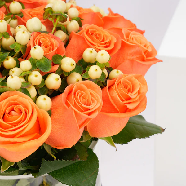 - مزهرية زجاجية اسطوانية الشكل مُنسقة بورد الجوري البرتقالي مع أزهار الهايبركم البيضاء.