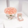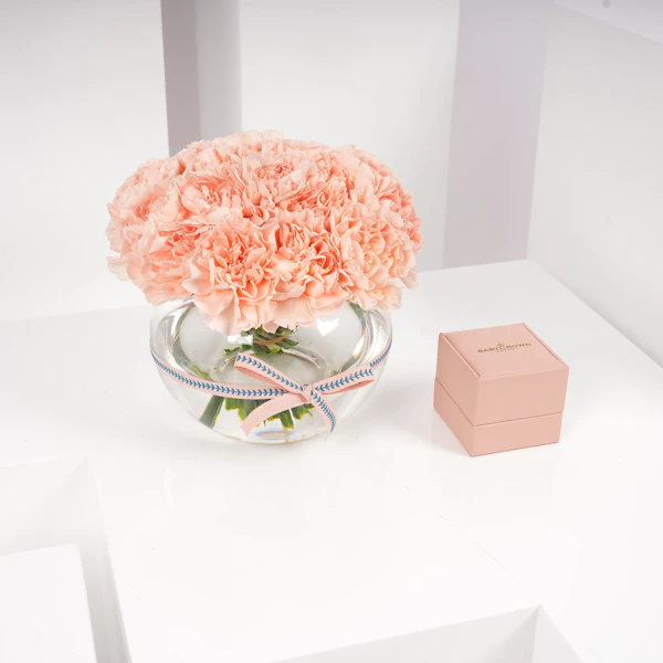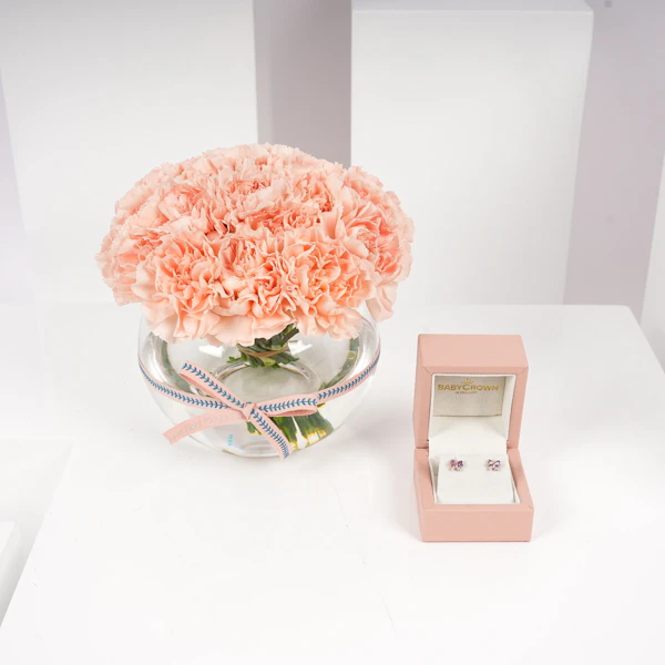 أقراط الوردة الألماس للأطفال من بيبي كراون - مثالية للأميرات والأمراء الصغار! هذه القطع الرائعة مصنوعة من ذهب 18 قيراط ومزينة بألماس أبيض فاخر لمزيد من البريق. مثالية لحفلة الزينة الأولى لصغيركم! ولإضفاء لمسة إضافية من الرقي، نقدم لكم مزهرية زجاجية مزين بزهور الكارنيشن البرتقالى الفاتح الزاهية. انتظروا الضحكات والأصوات اللطيفة للإعجاب!