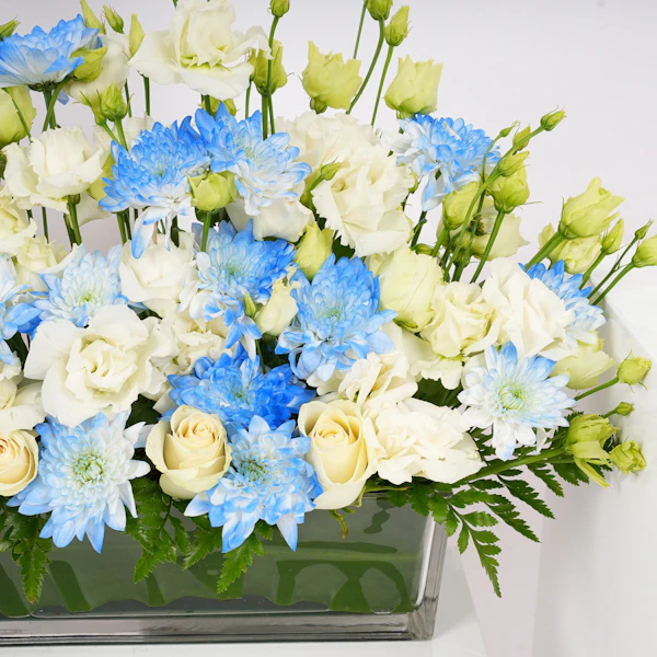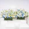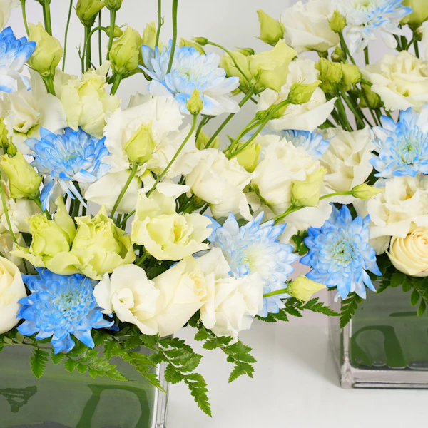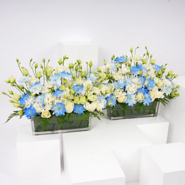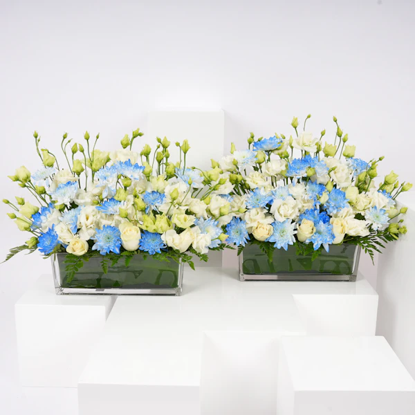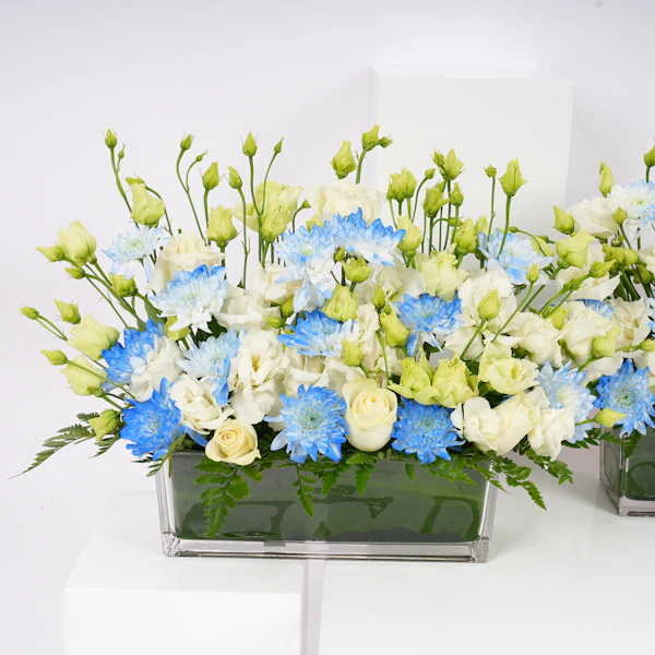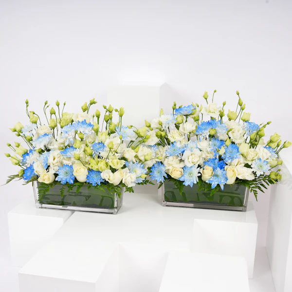 نقدم لكم مزهريات أستقبال المولود، التنسيق الرائع للاحتفال بوصول العضو الجديد إلى العائلة بالضحك والحب. يتضمن هذا التصميم الساحر الأقحوان الأبيض الثلجي وزهور الإستوما، موضوعة بعناية في مزهريتين زجاجيتين مستطليتين أنيقتين. إنها الطريقة النهائية لتمديد الترحيب الزهري الذي يجمع بين السعادة والدفء. هذه الزهور هي كمثل الإضافة اللذيذة إلى حفلة المولود الجديد - حلوة ولا تُنسى. احتفلوا بأناقة وزيّنوا هذه المناسبة المفرحة بلمسة من الفكاهة. إنها الباقة التي تقول: 'مرحبًا بكِ، يا صيغرى، دعينا نبدأ المغامرة!