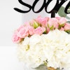 - فازة أزهار زجاجية مستديرة الشكل مُنسقة بورد الجوري الوردي الصغير، زهرة الهيدرينجا البيضاء، اليوكالبتس مع تغريسة تمنياتي لك بالشفاء العاجل باللغة الإنجليزية.