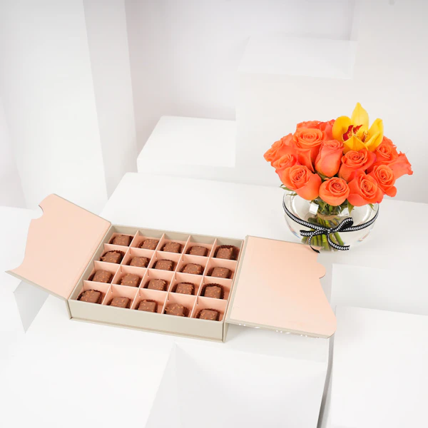 الأسعار شاملة الضرائبصندوق الشوكولاتة الكرنشي من فلاورد | مزهرية الورد المشرق