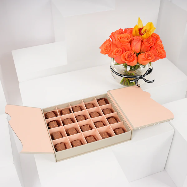 زنُسقت هذه الهدية الأنيقة بالتعاون مع ماركة فلاورد الخاصة بالشوكولاتة الراقية ذات الطعم المميز، ومع فريقنا المبدع بتنسيق الأزهار لتكون الإضافة المثالية لجميع مناسباتكم السعيدة، ولتساعد بايصال مشاعركم الدافئة لمن تحبون بأي وقت.