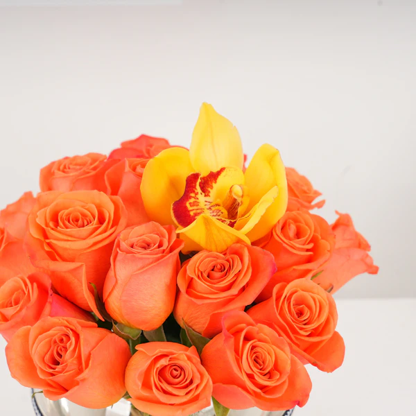 - مزهرية زجاجية مستديرة الشكل مُنسقة بورد الجوري البرتقالي مع زهرة السمبيديم الصفراء.