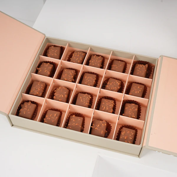 - صندوق شوكولاتة فلاورد والذي يحتوي على 20 قطعة من شوكولاتة الكرنشي الغنية بالطعم باللذيذ.