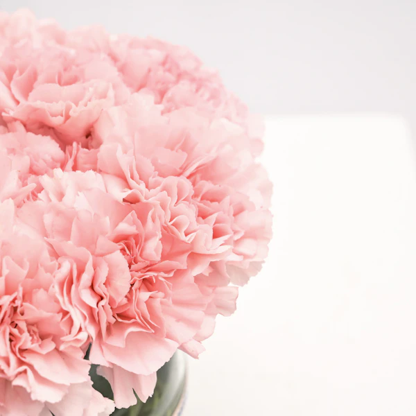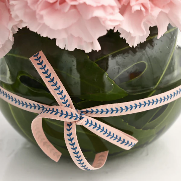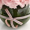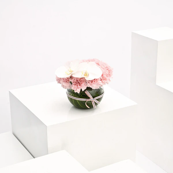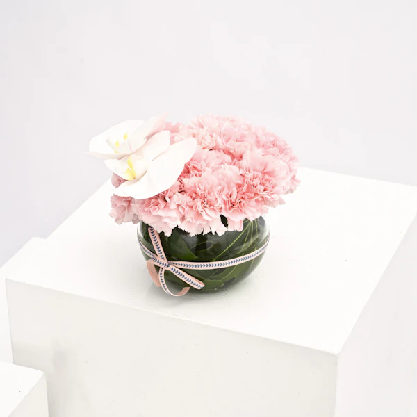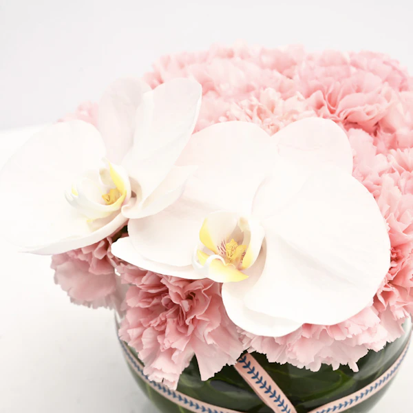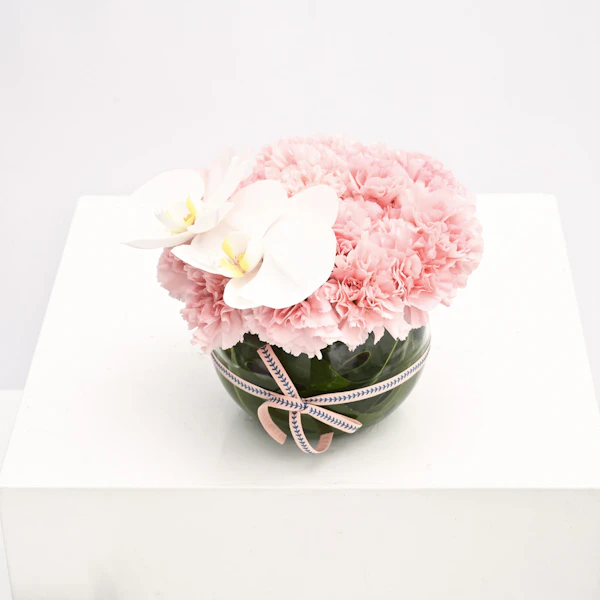 - فازة أزهار زجاجية مستديرة الشكل مُنسقة بأزهار الاوركيد البيضاء مع أزهار القرنفل الوردية.